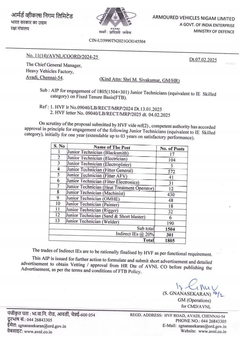 AVNL Junior Technician Notification 2025- Click Here to Download PDF (Short)
