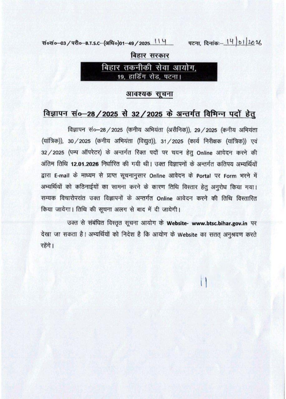 The application process for the Bihar Technical Service Commission will reopen on its official website. Candidates interested in applying must complete their registration on the portal before the last date. The BTSC will release the reopen application details on the official recruitment portal. In addition to registration, candidates are required to complete the application form along with all the supporting documents, including Age Proof, Educational Qualifications, Category Certificate, and Aadhar. A direct link to access the online form will provid here for the ease of candidates.
