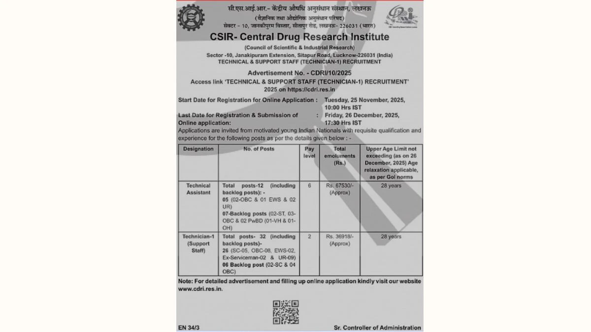 CSIR Central Drug Research Institute (CSIR CDRI) has released the CSIR CDRI Recruitment 2025 notification for Technical Assistant, Technician positions. The CSIR CDRI Recruitment 2025 application process will open on 25 November 2025, and candidates must submit their applications by 26 December 2025. Candidates who are interested in working in the medicine sector must apply for the CSIR CDRI Recruitment 2025 by visiting www.cdri.res.in. This is an excellent chance for eligible candidates who want to start or grow their careers in this sector. Those interested should go through this article to know all the important details about the application process, eligibility criteria, and other key information.