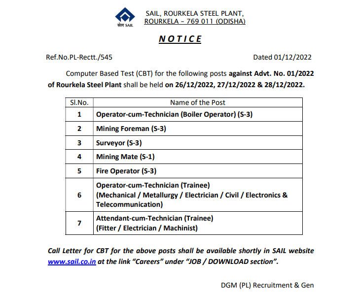 - Click on Rourkela steel plant – call letter for CBT to be held on 26/12/2022, 27/12/2022 & 28/12/2022 for remaining posts against advt. No. 01/2022.