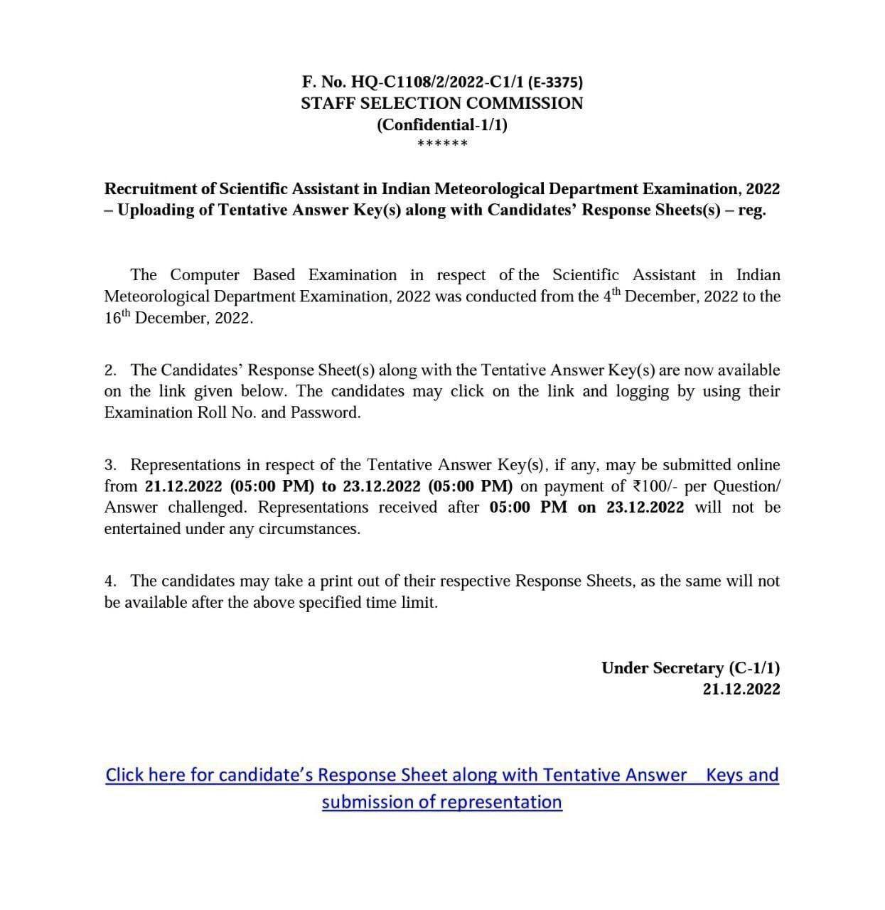 SSC IMD Scientific Assistant Answer Key 2023: The Staff Selection Commission has released the SSC IMD Scientific Assistant Answer Key 2023 on its official website @https://ssc.nic.in whose examination was conducted on the 14th, 15th, and 16th of November 2022. The candidates who appeared in the SSC Scientific Assistant IMD Exam 2022-23 are waiting for the commission to release the answer key which has been released on 21st December 2022.