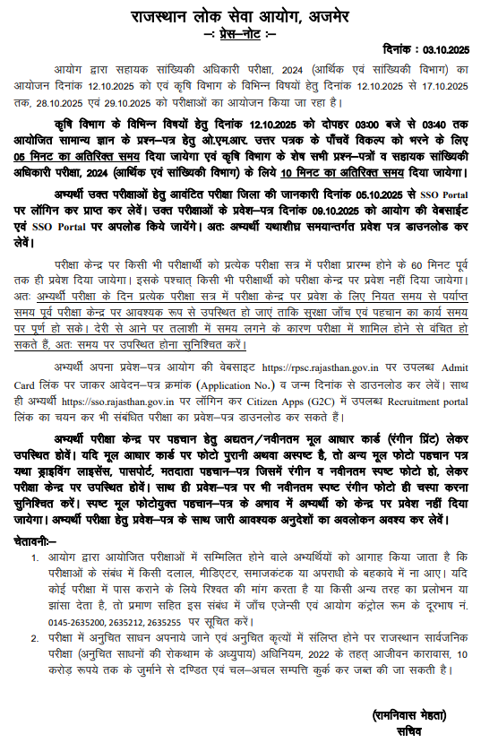 Candidates can check their allotted exam districts from 5 October 2025 onwards through the SSO Portal. The admit cards will be uploaded on 9 October 2025 and will be available for download from both the RPSC website (https://rpsc.rajasthan.gov.in) and the SSO Portal (https://sso.rajasthan.gov.in).