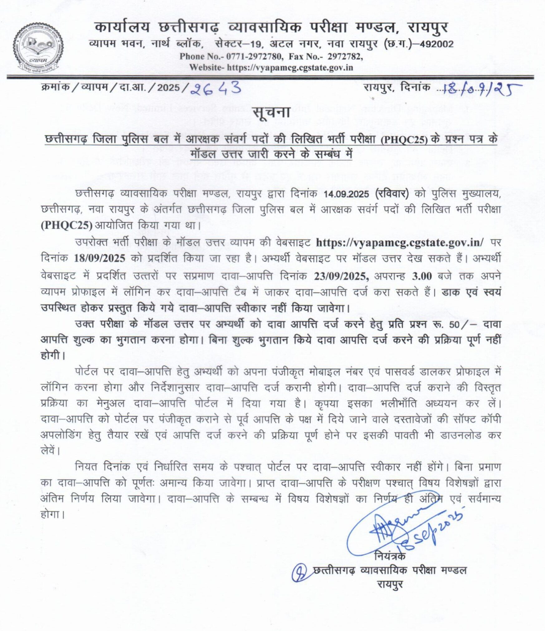 - Look for the link titled “छत्तीसगढ़ जिला पुलिस बल में आरक्षक संवर्ग पदों की लिखित भर्ती परीक्षा (PHQC25) के प्रश्न पत्र के मॉडल उत्तर”.