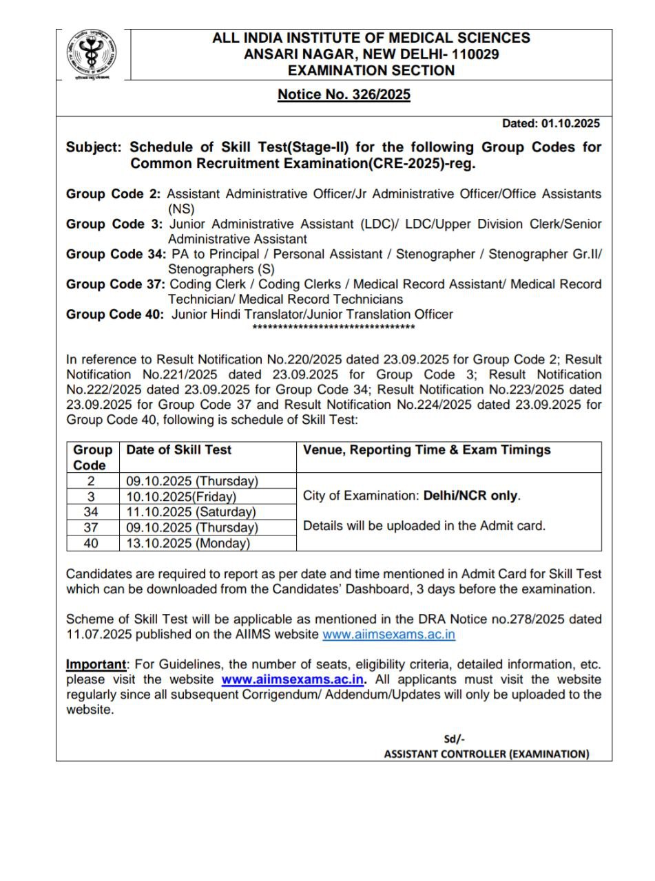 AIIMS CRE Skill Test Schedule 2025 | |||