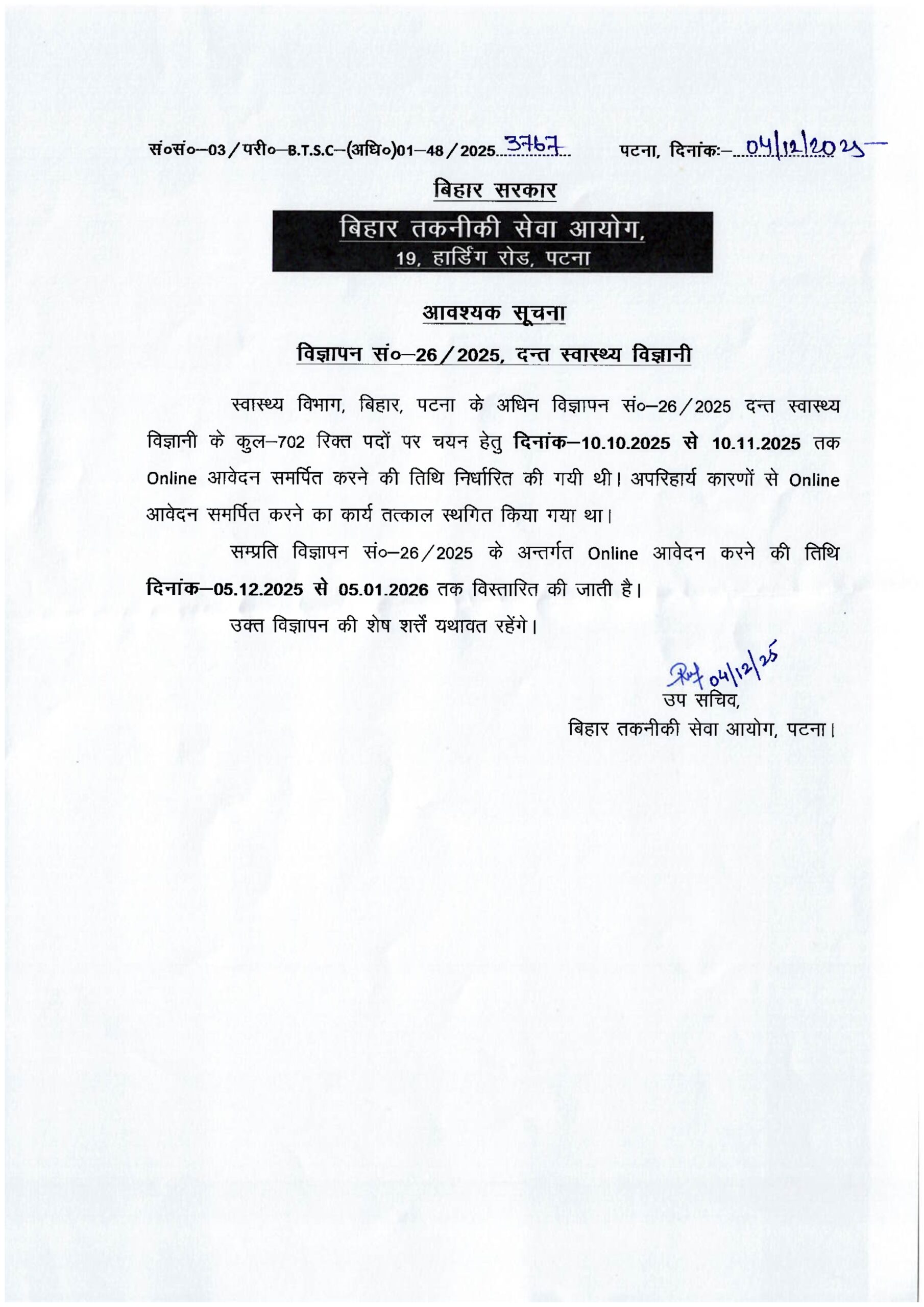 The Bihar Technical Service Commission (BTSC) has officially activated the online application for the BTSC Dental Hygienist Recruitment 2025 (Advt. No. 26/2025). Initially, candidates were allowed to submit their applications from 10 October 2025 to 11 November 2025. Applicants can now submit their online forms from 05 December 2025 to 05 January 2026. All other terms and conditions mentioned in the original advertisement will remain unchanged.