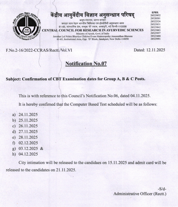 Earlier, the Central Council for Research in Ayurvedic Sciences (CCRAS) had announced that the CCRAS Group A, B, and C Exam 2025 would be conducted between 24th November and 3rd December 2025. However, as per the latest official notification, the Council has now revised and confirmed the detailed schedule.