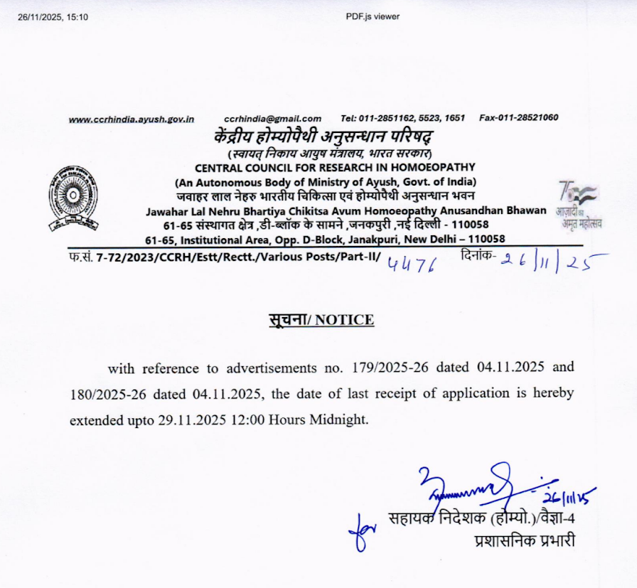 The CCRH authorities have officially extended the application timeline for the ongoing recruitment. Earlier, candidates could apply from 05 November 2025 to 26 November 2025, but to ensure wider participation and accommodate applicants who couldn’t complete the form in time, the deadline has now been pushed to 29 November 2025 (till 12:00 midnight). With this extension, aspirants still have a fair chance to complete their registration and avoid a last-minute rush.