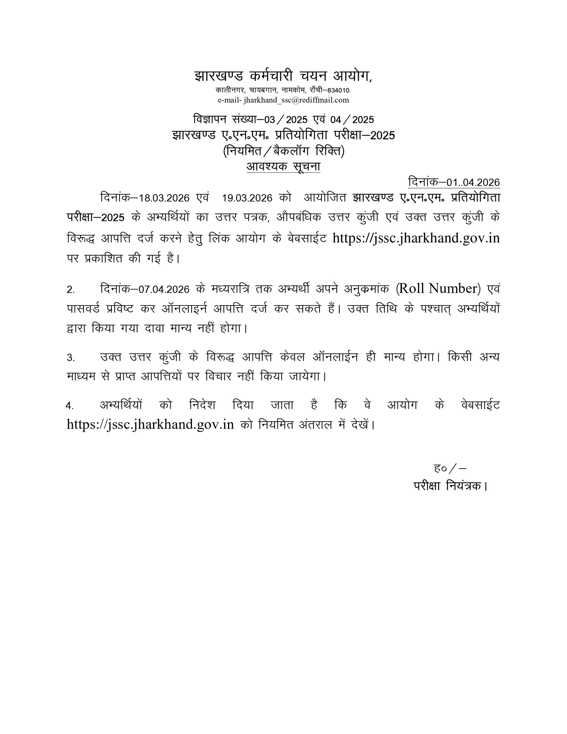 Jharkhand JSSC ANM Answer Key 2026 Objection Raise Link