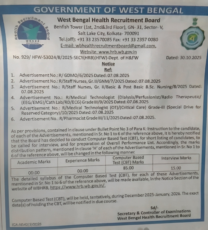 The West Bengal Health Recruitment Board has also declared the tentative WBHRB Pharmacist Exam Date 2025 for the Computer Based Test that has now been added in the selection process. According to the notice published by the board, the WBHRB Pharmacist Exam 2025 will likely be held between the time period of December 2025 – January 2025. Candidates can check the official WBHRB Pharmacist Exam Date 2025 Notice below.