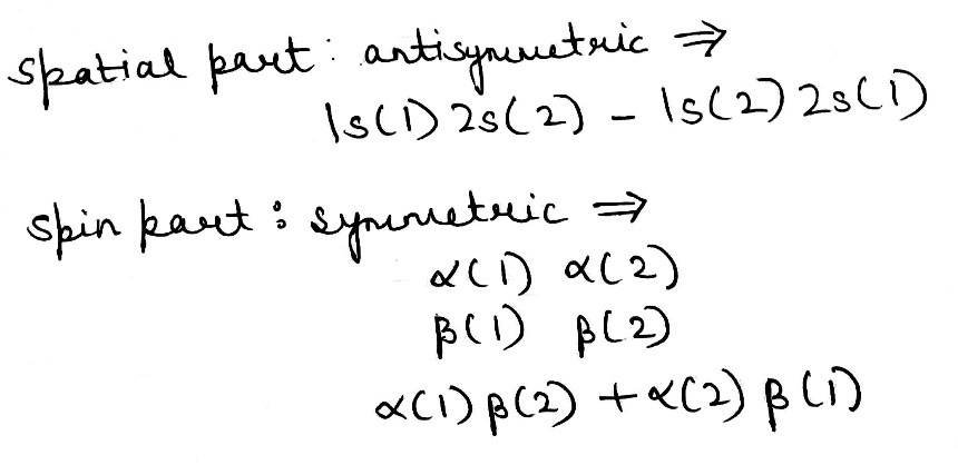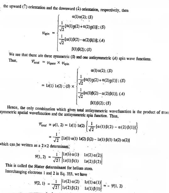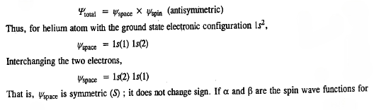 It was proposed by J.C. Slater in 1930 that for a multielectron atom the total wave function must consist of the spatial part and the spin part. He showed that the total atomic wave function, which is the product of the spatial wave function and the spin wave function, is antisymmetric (A) with respect to the interchange of electrons, i.e.