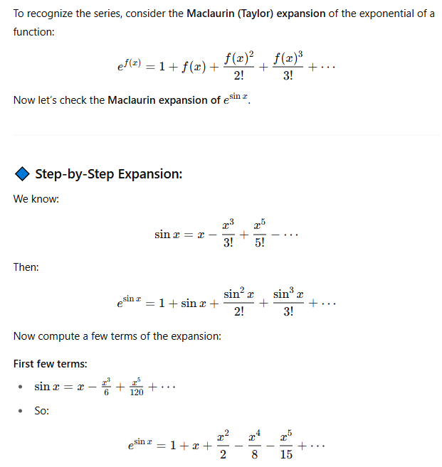 To recognize the series, consider the Maclaurin (Taylor) expansion of the exponential of a function:ef(x)=1+f(x)+2!f(x)2+3!f(x)3+⋯Now let’s check the Maclaurin expansion of esinx.Step-by-Step Expansion:We know:sinx=x−3!x3+5!x5−⋯Then:esinx=1+sinx+2!sin2x+3!sin3x+⋯Now compute a few terms of the expansion:First few terms:∘ sinx=x−6x3+120x5+⋯∘ So:esinx=1+x+2x2−8x4−15x5+⋯