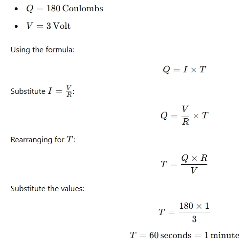 180 Coulombs of charge passes in a given time "t" through a wire of a 1 ohm when connected to a 3 VDC supply. Identify the value of "t" from the optio