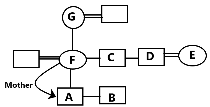 Since G has only one daughter (F), it means F must be A and B’s mother.