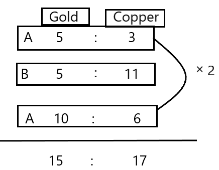 Alloy A is formed by the combination of gold and copper in the ratio 5:3.