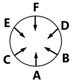 A, B, C, D, E, F, G and H are sitting around a circle at an equal distance facing the centre of the circle.