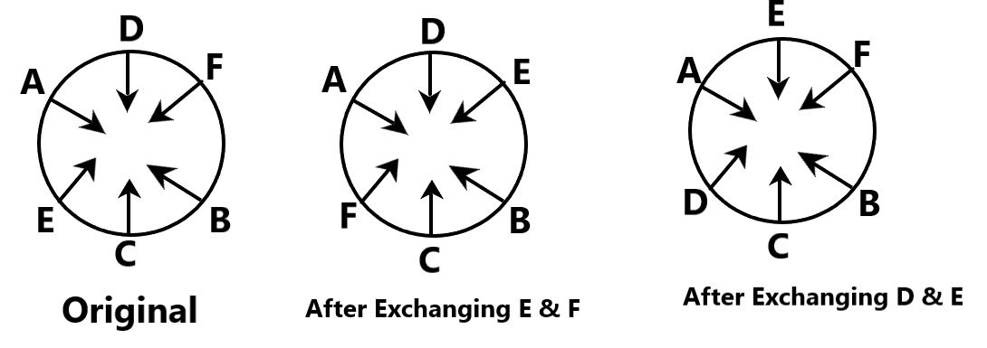 If E and F exchange their positions, E will be second to the left of A.