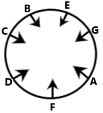 A, B, C, D, E, F, G and H are sitting around a circle at an equal distance facing the centre of the circle.