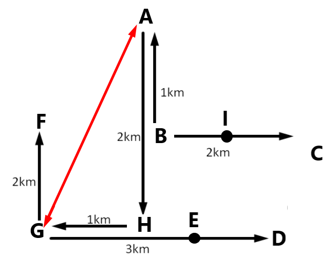 A, B, C, D, E, F, G, H and I are nine houses. C is 2 km east of B. A is 1 km north of B and H is 2 km south of A. G is 1 km west of H while D is 3 km east of G and F is 2 km north of G. I is situated just in middle of B and C while E is just in middle of H and D. What is the approximate distance between A and G ?