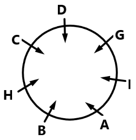 A, B, C, D, E, F, G and H are sitting around a circle at an equal distance facing the centre of the circle.