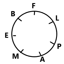 A, B, E. F, L. M and P are sitting around a circular table, facing the centre. F sits second to the left of E. A sits third to the right of B. M sits third to the left of L. A sits to the immediate right of M. P is not an immediate neighbour of M.