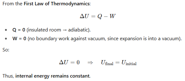 A balloon containing an ideal gas is initially kept in an evacuated and insulated room. The balloon ruptures and the gas fills up the entire room. Which one of the following statements is true at the end of above process?