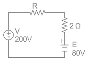 Where V=Source voltage=200V,E=Battery=80V,R=Unknown Series ResistanceIn this given circuit,V=200V,E=80V,Internal resistance (r)=2ΩAs per KVL, V−IR−Ir−E=0;I=current in given circuit=5A200−I×R−I×2−80=05R=200−80−10=110R=5110=22Ω