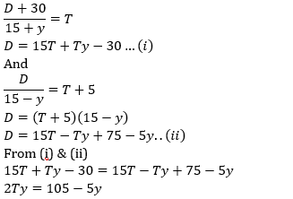 A boat covers (D+30) km downstream in T hours and the same boat covers D km upstream in (T+5) hours. If the speed of the boat in still water is 15 km/h, then find the speed of the stream (in km/hr).