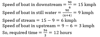 A boat takes 6 hours to cover a distance of 90 km downstream and in still water the boat takes 4 hours more to cover same distance. Find the time taken by boat to cover the distance of 36 km upstream?