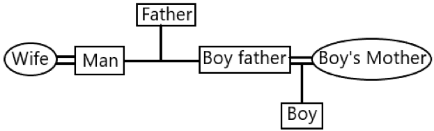 - Pointing at him, a man in the audience seated next to the boy’s father said, “He is the son of the husband of a lady who is the daughter-in-law of the father-in law of my wife”.