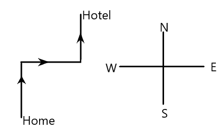 Rohit walks 50 metres North, then turns right and walks 30 metres, then again turns right and walks 15 metres.