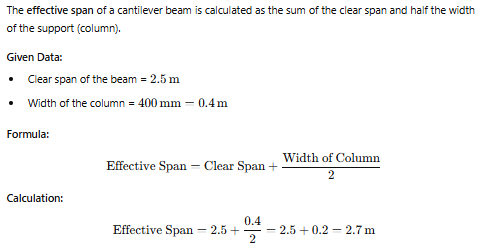 A cantilever beam of size 230 × 400 mm has a clear span of 2.5 m and is supported on a 400 × 400 mm column. The effective span of the cantilever is-