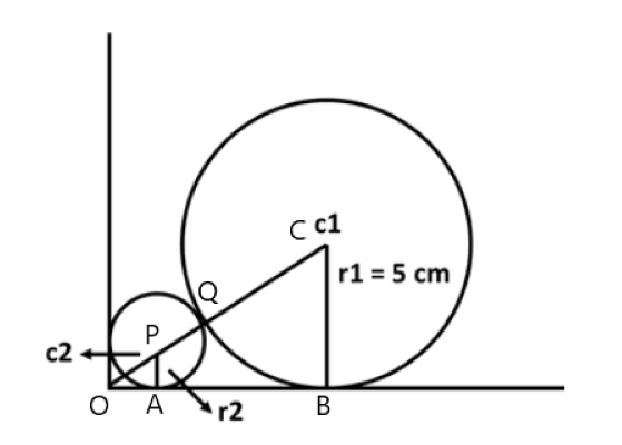 A circle having centre c1, radius r1= 5 cm is placed against a right angle.
