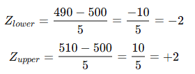 So, the range 490 ml to 510 ml corresponds to Z = -2 to Z = +2 on the standard normal distribution.