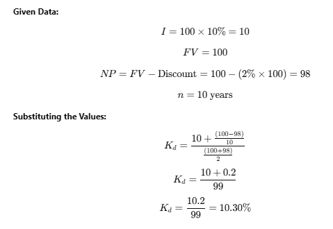 A company raises ₹1,00,000 by issuing 1000, 10% debentures of ₹100 each at a 2% discount, redeemable after 10 years. If the corporate tax rate is 40%, what is the cost of capital?
