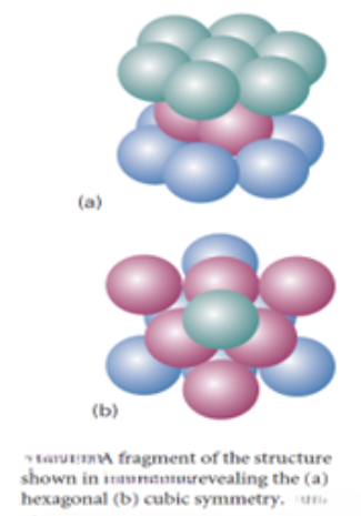 The third layer may be added in either of two ways. In one, the spheres are placed so that they reproduce the first layer, to give an ABA pattern of layers. Alternatively, the spheres may be placed over the gaps in the first layer, so giving an ABC pattern. Two polytypes are formed if the two stacking patterns are repeated in the vertical direction. If the ABA pattern is repeated, to give the sequence of layers ABABAB..., the spheres are hexagonally close-packed(hcp). Alternatively, if the ABC pattern is repeated, to give the sequence ABCABC..., the spheres are cubic close-packed (ccp). The ccp structure gives rise to a face-centred unit cell, so may also be denoted cubic F (or fcc, for face-centred cubic). Strictly speaking, ccp refers to a close-packed arrangement whereas fcc refers to the lattice type of the common representation of ccp. However, this distinction is rarely made.