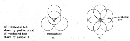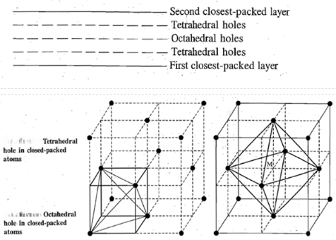 The intersections of the lines at M are not occupied by an atom and this is surrounded by six atoms at the corners of an octahedron. This intersection becomes an octahedral hole when the atoms just touch one another: Besides the intersection M, there are twelve more intersections at the centres of the edges. Since each edge is common to four-unit cells, there are only three intersections (holes) from edges that belong completely to one unit cell. Thus, in all we have four octahedral holes in one unit cell and hence one octahedral hole per closest-packed atom.