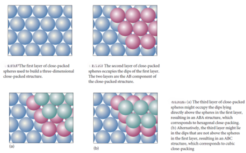 A close-packed layer of identical spheres, one with maximum utilization of space. A close-packed three-dimensional structure is obtained by stacking such close-packed layers on top of one another. In all polytypes, the spheres of second close-packed layer lie in the depressions of the first layer.