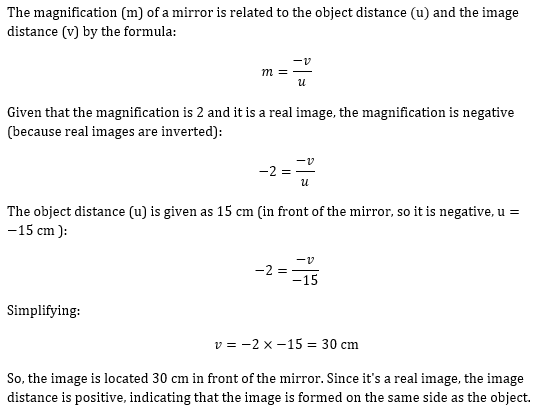 A concave mirror produces 2 times magnified real image of an object placed 15 cm in front of it. At what distance from the front of the mirror is t