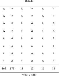 - Pattern 2 (a, a, a, a, A, A, A, A): Similarly, (a,a), (a,a), (A,A), (A,A), meiotic products a, a, A, A, again FDS.