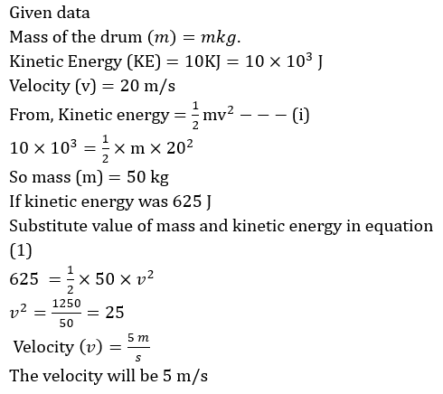 A drum of mass ‘m’ kg was rolled down a ramp. At the bottom of the ramp its kinetic energy was 10kJ and velocity was 20m/s. With what velocity (in m/s) was it pushed down the ramp if its initial kinetic energy was 625 J?