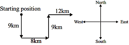 A fishing boat sails 9 km South in still water. It then truns East and sails 8 km, turns North and sails 9 km, then turns to its right and sails 12 km
