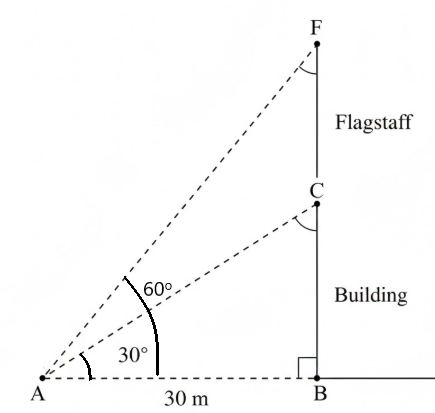 A flagstaff stands on the top of a building. At a distance of 30 m away from the foot of the building, the angle of elevation of the top of the flagst