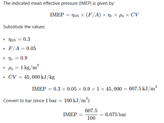 A four stroke automobile engine operates at a fuel-air ratio of 0.05, volumetric efficiency of 90% and indicated thermal efficiency of 30%. Given that the calorific value of the fuel is 45 MJ/kg and the density of air at intake is 1 kg/m³, the indicated mean effective pressure for the engine is