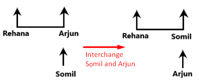 A group of friends are playing a game sitting together facing north. Rehana is to the left of Arjun, who is seated exactly in front of Somil. If Arjun exchanges his position with Somil, to which direction of Arjun is Rehana seated now?