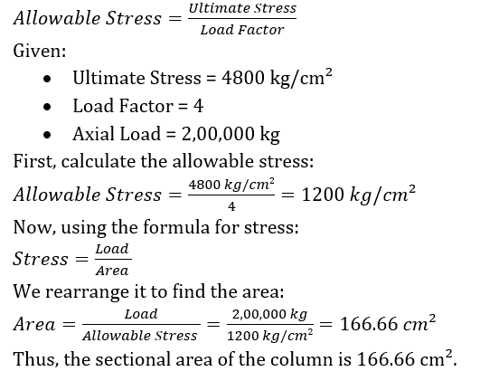 A hollow steel column has to carry an axial load of 2,00,000 kg and the ultimate stress for the steel column is 4800 kg/cm² and allows a load factor of 4. What is the sectional area of the column?
