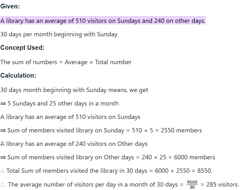 A library has an average of 510 visitors on Sunday and 240 on other days. The average number of visitors per day in a month of 30 days beginning with a Sunday is :