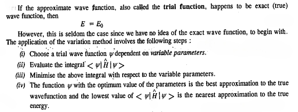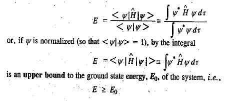 According to the variation method, also called the variation theorem, if ψ is an approximate wave function of a quantum mechanical system, an atom or a molecule, described by the Hamiltonian