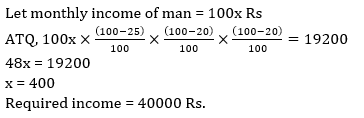 A man invested 25% of his monthly income on food. From the remaining, he spends 20% on rent. If the man spends 20% of the remaining income on education and saved Rs 19200, then find the monthly income of man?