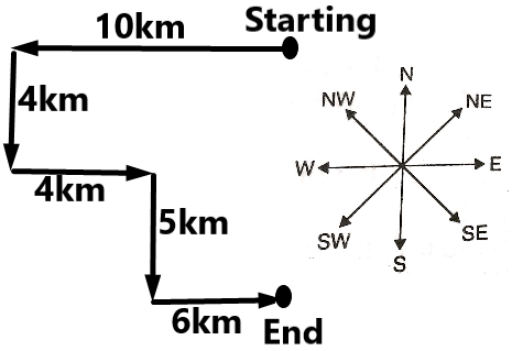 A man travels 10 km towards the west and turns left and travels 4 km and then travels another 4 km towards the east. He then turns to his right and travels 5 kms. Then, he turns to his left and travels 6 kms. In which direction is he from his starting position?