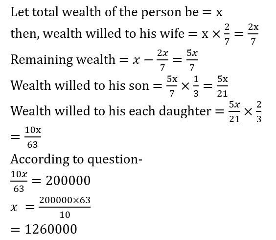 if each daughter gets 2/3rd of the son’ s share and each of the three daughters gets Rs.2,00,000, then what was the man’s wealth?